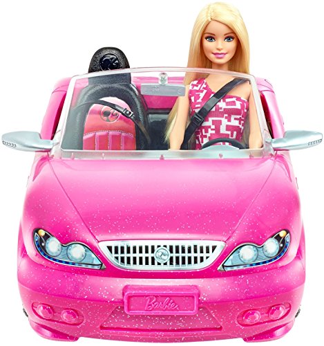 -. Binding : Toy -. Brand : Barbie -. EAN : 0887961229936 -. Feature : Hit the road in style with this super glam Barbie convertible car / Barbie doll is ready for anything dressed in a pink dress with graphic white print, strappy pink shoes and sunglasses perfect for a sunny drive / Her two-seater vehicle is designed in a sparkly pink with silvery accents / Realistic tires are ready to roll into adventure / Black interior seats feature seat belts for safety and Barbie "upholstery" labels for style -. Label : Mattel -. Manufacturer : Mattel -. Model : DJR55 -. MPN : DJR55 -. PackageQuantity : 1 -. PartNumber : DJR55 -. ProductGroup : Toy -. ProductTypeName : TOYS_AND_GAMES -. Publisher : Mattel -. Studio : Mattel -. Title : Barbie Convertible and Doll Pack -. UPC : 887961229936 -. Warranty : 1 year warranty against manufacturer defects