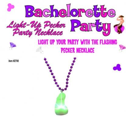 Studio : Hott Products Publisher : Hott Products Binding : Health and Beauty Product Description Bachelorette Light Up Pecker Necklace light up your party with the flashing pecker shaped necklace. Easy on/off push button function. Super bright fun flashing light! Light Up Pecker Party Necklace from Hott Products Unlimited. And a bottle of Astroglide 2.5 oz 0