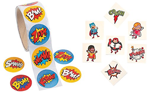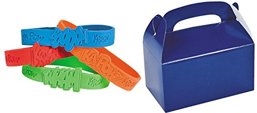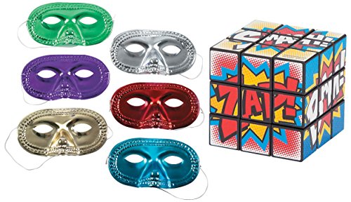 - Feature : Nice Superhero Party Favor Bundle, enough for 12 Children. 244 Pc set includes: 12 Blue Treat Boxes. You can add the stickers provided in this pack to Decorate the boxes. / 12 Superhero Mini Magic Cubes, 1 1/2". Twist the rows to form a superhero word on each side. / 24 assorted color Metallic Mask, enough for each child to have two masks. / 72 Superhero temporary tattoos..... 1 Superhero Sticker Roll - 100 pc / 24 Rubber Super hero bracelets...... 1 Shoot for the Stars "Bonus Bag". Bag includes a surprise toy or toys with a "Superhero" theme. You can use this Bonus any way you choose, like giving it as an additional gift to the birthday child, using it as a reward, would make a terrific door prize or even as a prize for the winner of a party game.