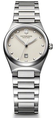 Featuring a stylish cream dial, this elegant ladies Victoria is the perfect accessory for any occasion. . . . . Cream dial with silver-tone hands and markers features an enamel pattern that radiates from the Victorinox logo position . . Stainless steel case and bracelet . . Anti-reflective sapphire glass crystal is virtually scratch-proof . . Luminous hands . . Caseback with screws . . Low battery indicator . . Stainless steel bracelet features a push-button deployment clasp . . Date window at the 6 o'clock position . . Water resistant to 100 meters (330 feet) . . Case width 28mm (approximately 1 1/8 inches) . .