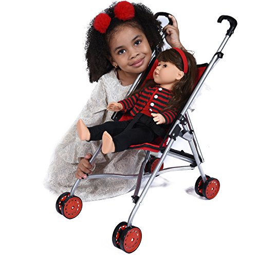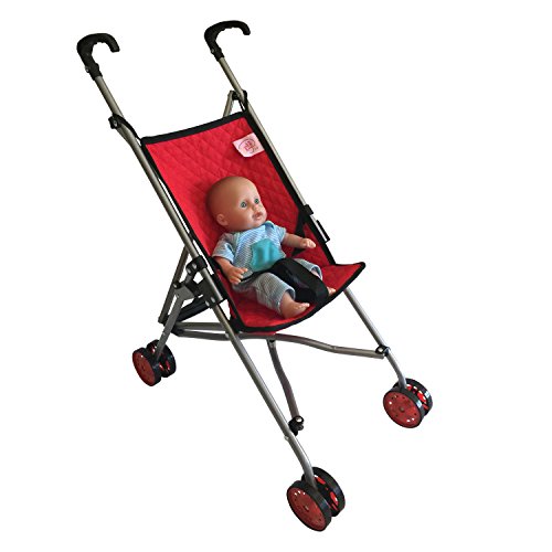 This adorable doll stroller features a strong and durable built and offers and easy fold and go design. This stroller is from our new LUXURY COLLECTION defined by its beauty and durability. The double sided red quilted fabric is twice as strong as any other doll stroller, and will last for many years of doll play. Makes for the perfect gift for the little girl in your life. Buckle to hold doll secure. Easy fold and go. Strong Metal Frame. Manufactured by; The New York Doll CollectionTM, a Modern Company for Dolls and Kids.Feature