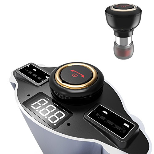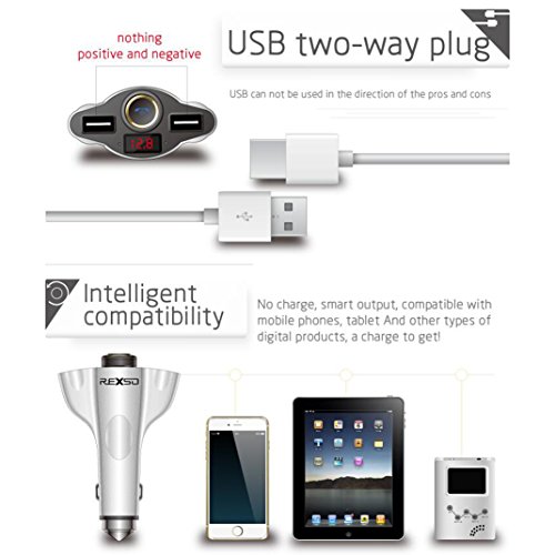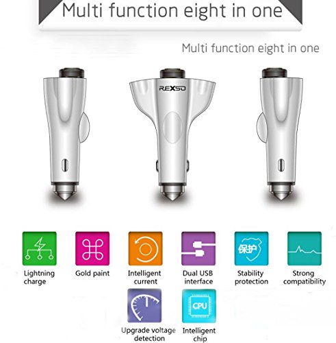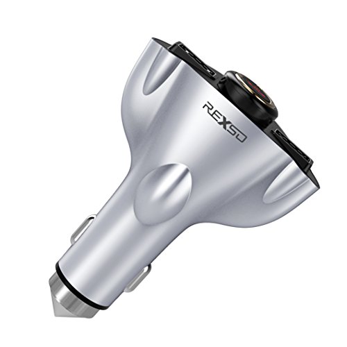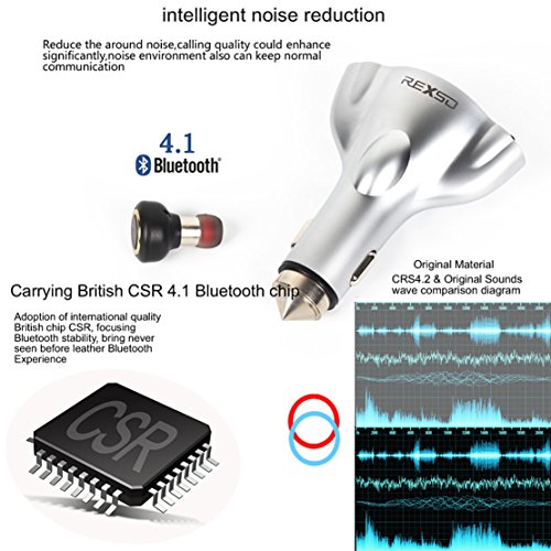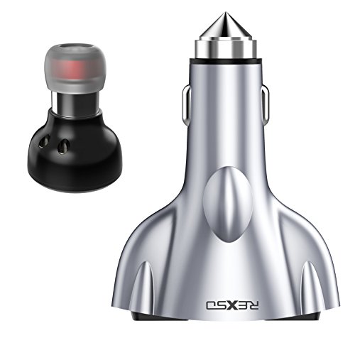 REXSO R20 Car Charger --- Two-way USB Port Fast Phone Power Charger with Bluetooth 4.1 Earphone& Lifesaving Hammer Function (Silver )