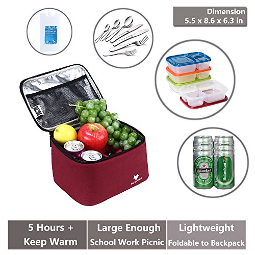 PERFECT BENTO BAG TO STORE - Spacy enough to store 6 cans of 330ml coke,some fruit,2 food jar of 10 ounce or other lunch boxes measuring 8.6in length,6.3in width,5.5in height.Added mesh pocket inside for fork,spoon and napkin reminds you equip utensils and prevent mess.Sturdy 2 zipper pulls with closed-seam system strengthens lunch box thermal insulation function.ALOPEX lunch bag is your ideal choice for simple but efficient one you are finding.