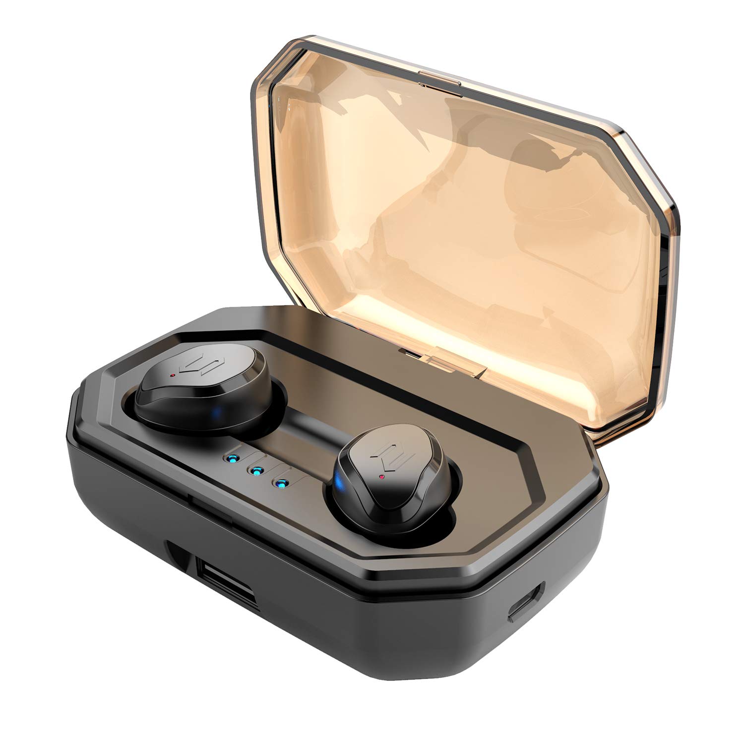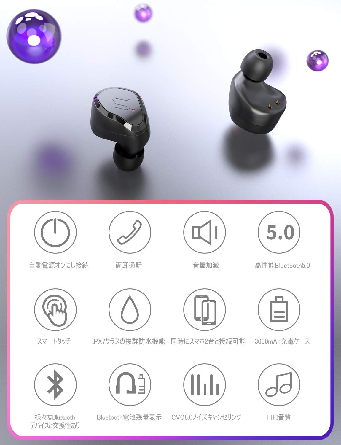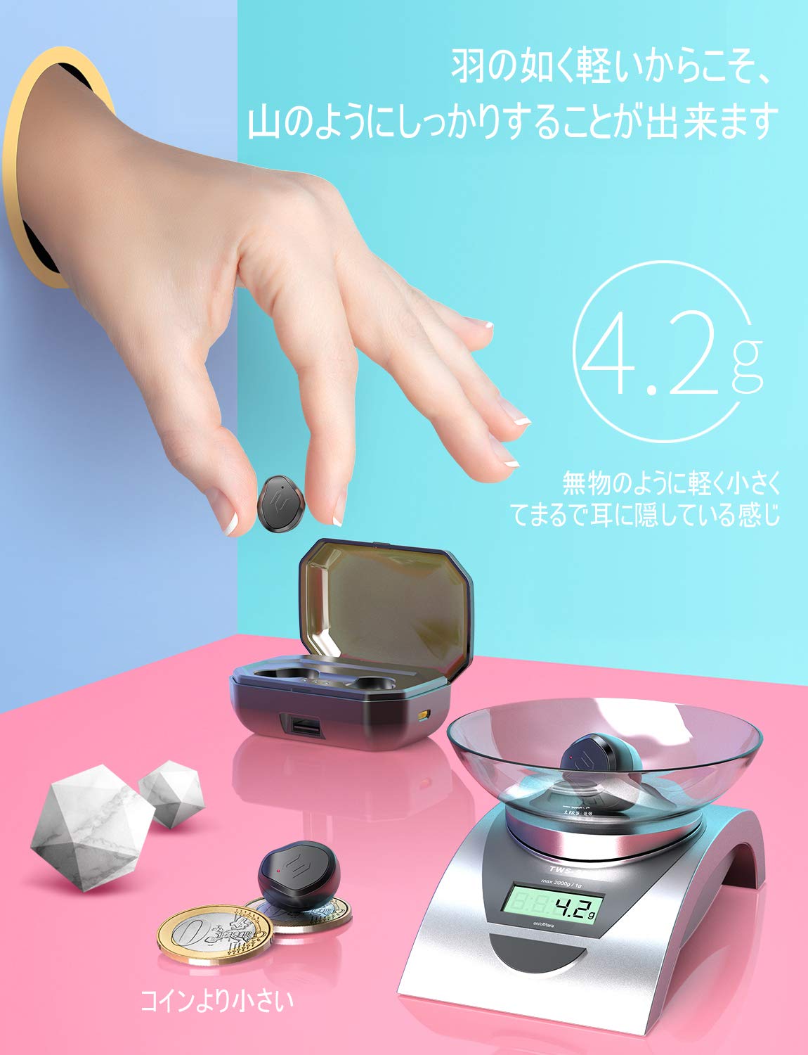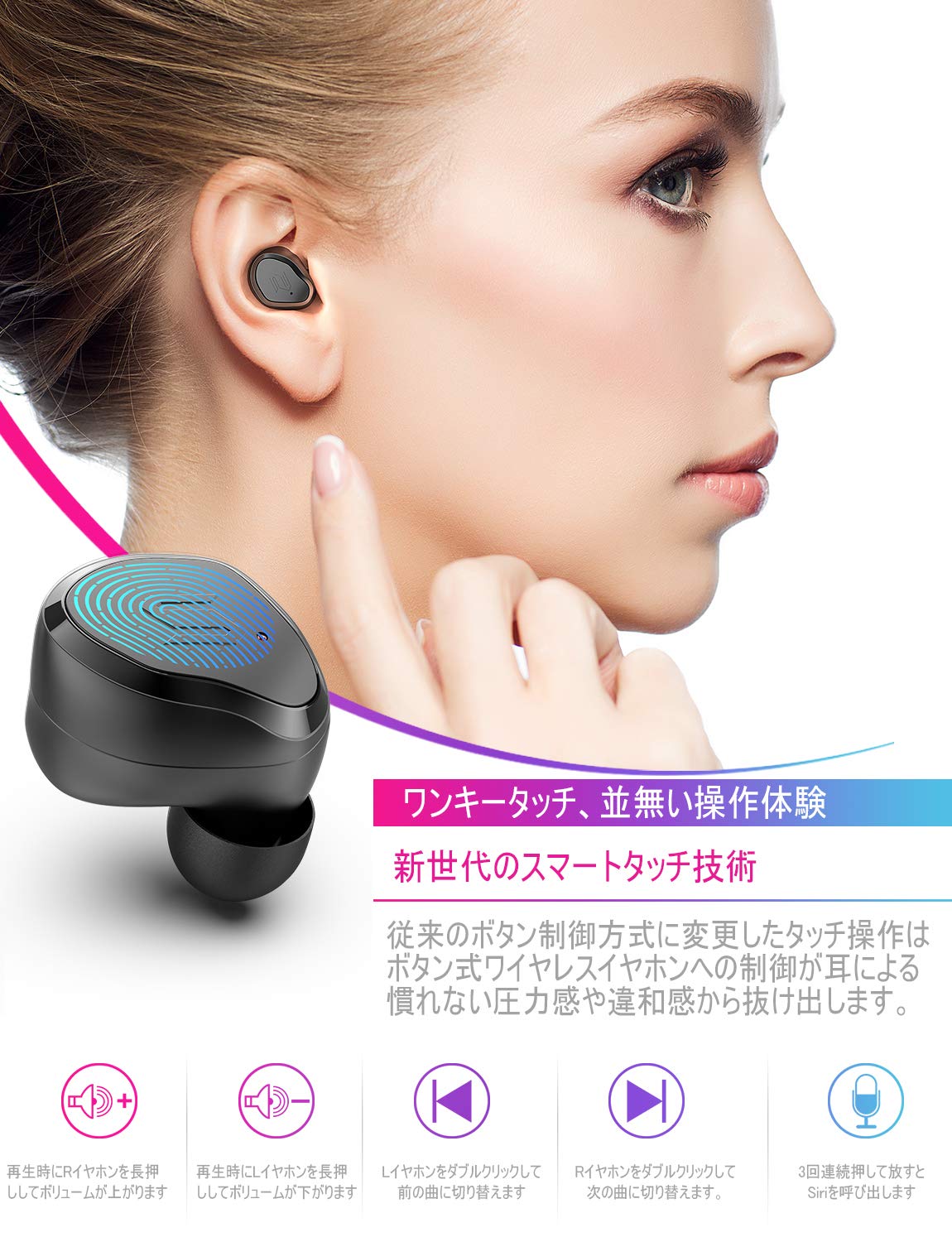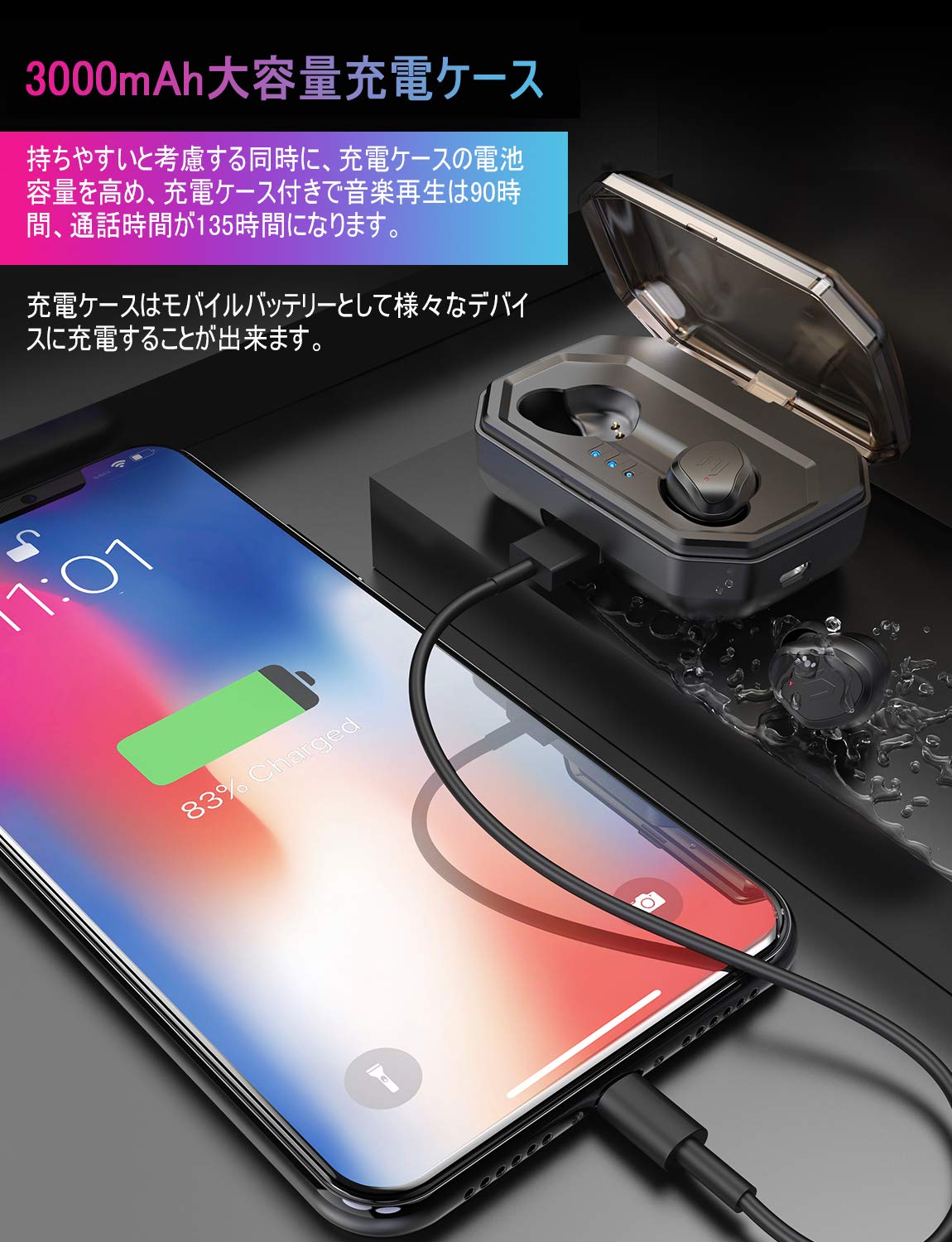 【コスパ最高な完全ワイヤレスイヤホン】最先端のBluetooth 5.0+EDRが搭載されているため、データ転送速度が従来の2倍になり、ブロードキャスト通信容量が8倍に増やします。まさに高速・安定かつ途切れのない接続体験が実感できるBluetoothイヤホンです。 尚、先端技術のアンテナが搭載されているなので、信号が強くなり、IOSとAndroid両方とも対応可能です。ノイズキャンセリング機能がある為、イヤホンへの騒音をしっかり低減してくれますので、屋外での音楽鑑賞の質の向上だけでなく、仕事、勉強の効率向上 にも役立ちます。ケーブルを完全にカットし左右独立完全無線仕様は一度体験すれば有線イヤホンに戻られなくなります。特にiPhone XやiPhone 8などはBluetooth5.0対応機種なので、これらの機種をお使っている方々には、大変オススメです。