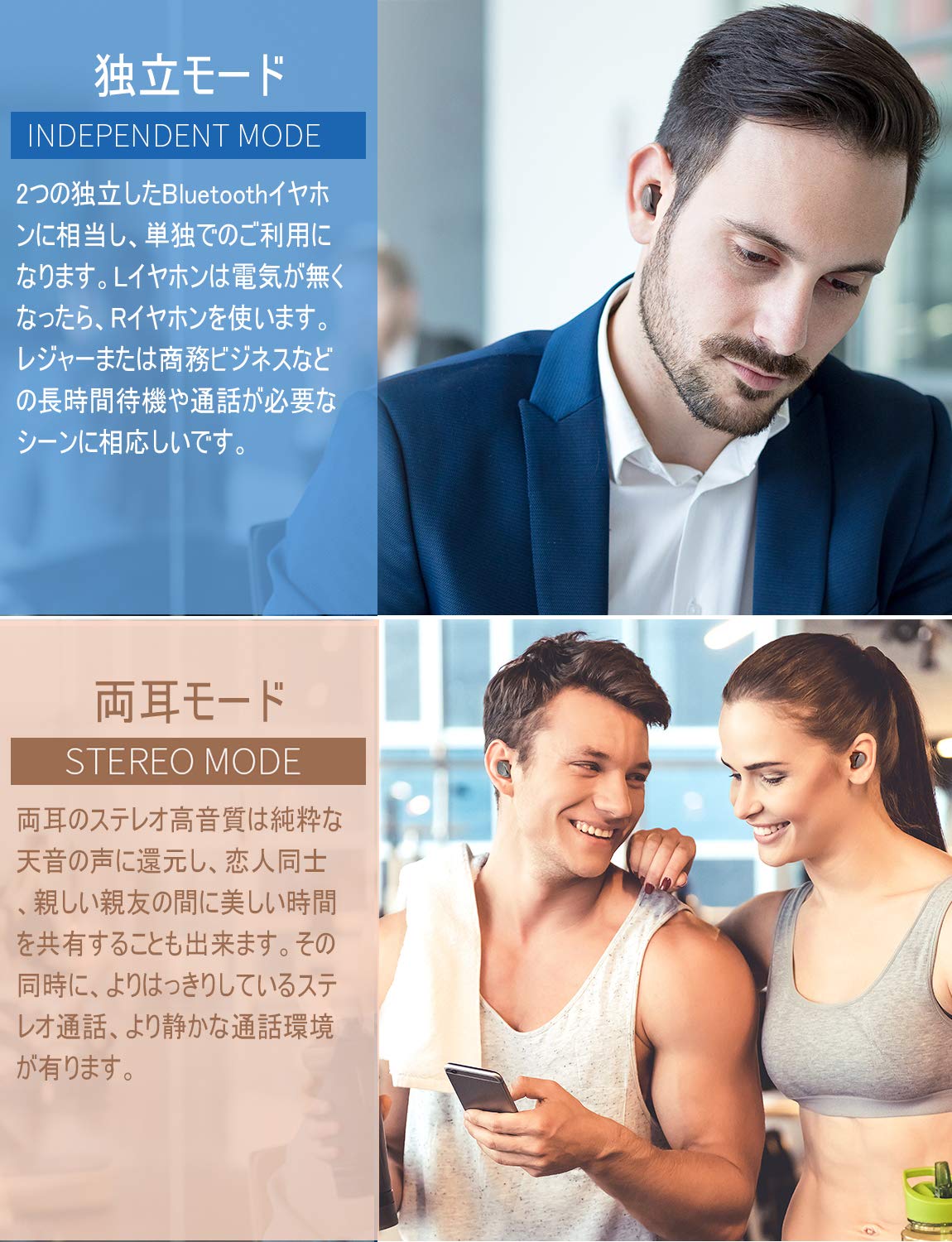 【自動ON/OFF・オートペアリング】 :ワイヤレス イヤホンは収納ケースから取り出すだけで電源が自動的に入るので電源ボタンを押す必要がありません。LとR二つのイヤホンは自動的にペアリングされるので、お使いになるデバイスのBluetooth機能をオンにし、 デバイス名をクリックするだけで簡単にペアリングが出来ます。一度ペアリング登録が終わりましたら、次回充電ケースから取り出すだけで、二つのイヤホンは自動的にペアリングされるオートペアリングモードに入ります。超簡単な操作で機械に苦手の方々にも 楽に使えます。