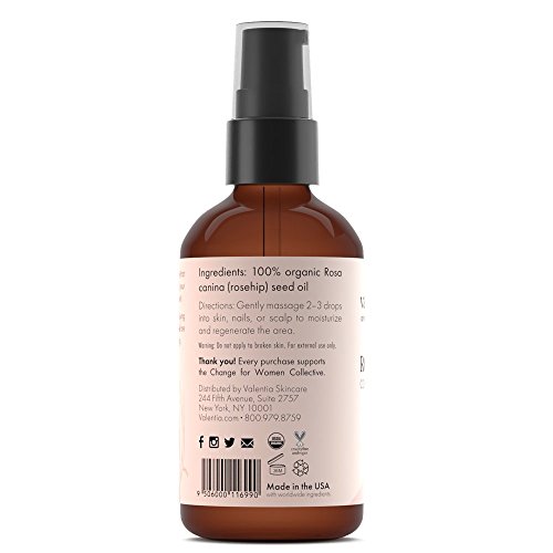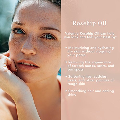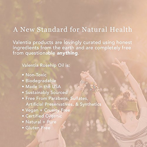 - Nourish Your Skin With The Highest Quality Available. Valentia Rosehip Oil is USDA Certified Organic, 100% pure, natural, synthetic free, unrefined, virgin, and never tested on animals. It’s extracted from the seeds of wild rosehips, cold-pressed in small batches, then bottled with love in dark amber glass to preserve this high quality oil so you can indulge your skin each day without compromise.