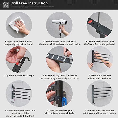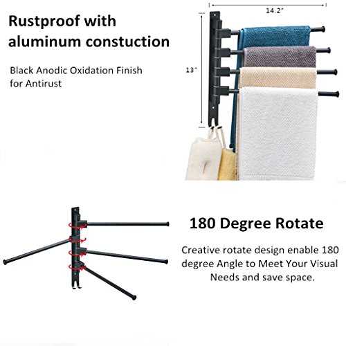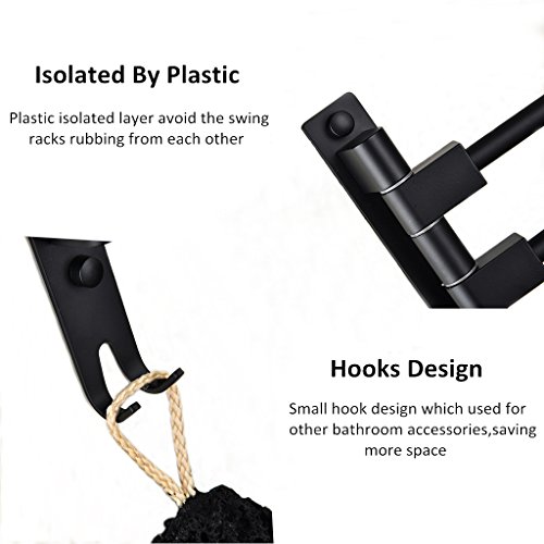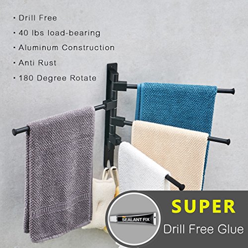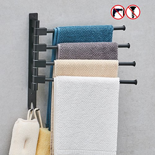 BESy Aluminum Swing Out Towel Bar 4-Bar Self Adhesive Folding Arm Swivel Hanger Bathroom Storage Organizer Space Saving Drill Free black, Wall Mount on all smooth or textured surfaces