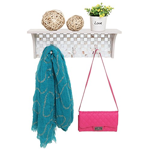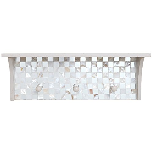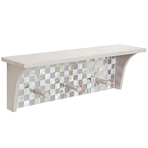 DECORATIVE MOSAIC TILE DESIGN WHITE WOOD FLOATING ORGANIZER DISPLAY RACK SHELF W/ 3 STORAGE COAT HOOKS