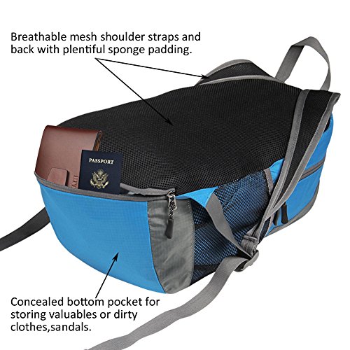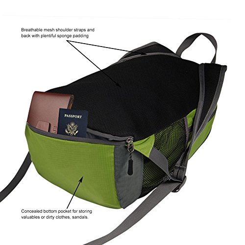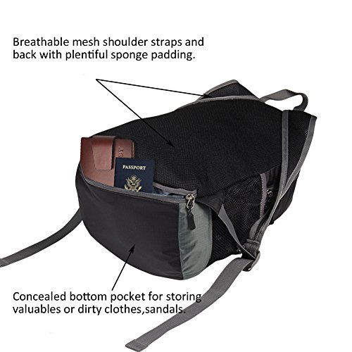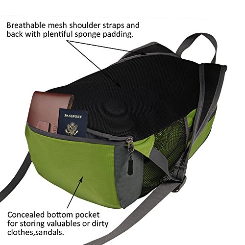 Multiple Roomy Compartments: 1.Main pocket is Large enough to carry what you need in the trip. 2.Front zippered pocket is great for quick access such as hand mirror. 3.Inner zippered pocket is great place for valuables such as cash, purse, credit cards and passport. 4.Two mesh pockets in both sides to hold water bottle or umbrella. 5.Concealed bottom pocket can also be use for storing valuables, or, separate wet/dirty stuff or less used items from the rest.