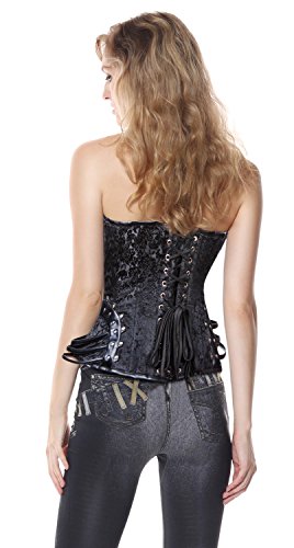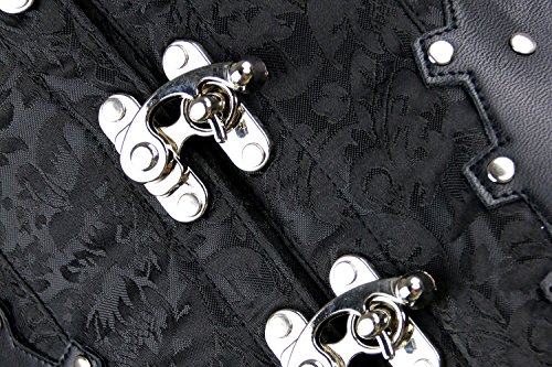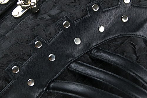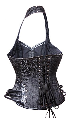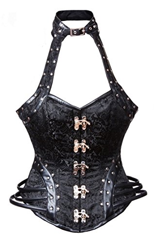 Binding : Apparel Product Description Steampunk gothic brocade steel boned outerwear corset features: a black buckles halter neck design, rivets trimming in two side, waist with different size faux leather lines, busk closure in the front, lace-up in back for cinching, g-string not include.