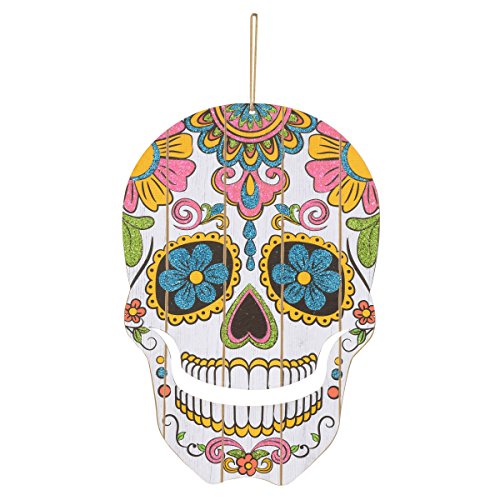 - Each die-cut skull-shaped decoration is made from durable MDF and is decorated with a Day of the Dead design.