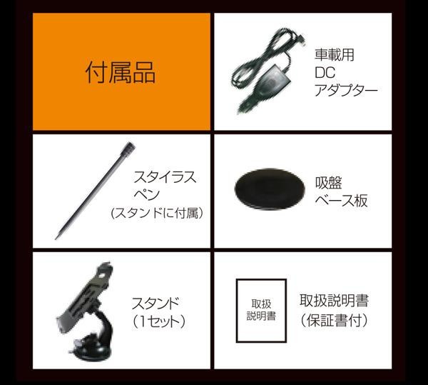 | 付属品 | 車載用DCアダプター スタイラスペン(スタンドに付属) 吸盤ベース板 スタンド(1セット) 取扱説明書兼保証書(保証期間:1年間) |