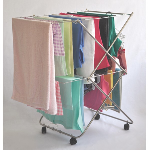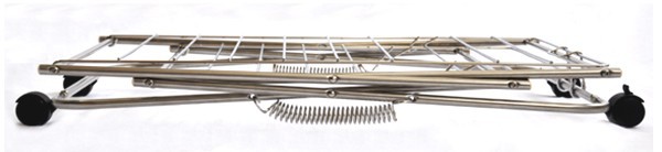 | 足元に組み込まれたスプリングの作用で、女性一人の力でも簡単に広げられます。たためば約8cm巾となり、立てかければ収納場所をとりません。壁や棚と棚の間などデッドスペースに立てかけて収納できます。ストッパーで固定すれば、広がることはありません。物干し竿約2本分の洗濯物を一度に干せます。移動もスムーズなキャスター付!サビにくいオールステンレス製です! |