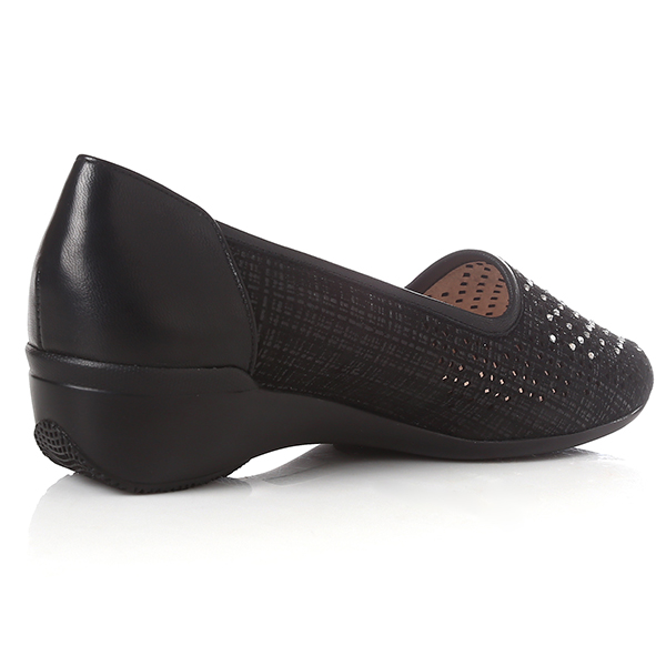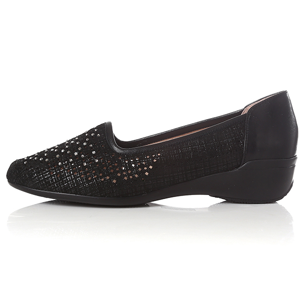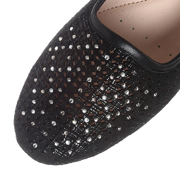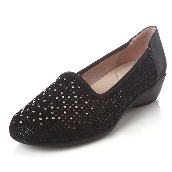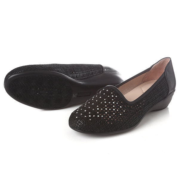 컷아웃 레이저와 반짝이는 핫비즈 장식이 포인트인 여성스러운 스타일로, 고무몰드와 발볼을 감싸주는 기본 라인이 착화감이 우수한 컴포트 스타일의 슬립온