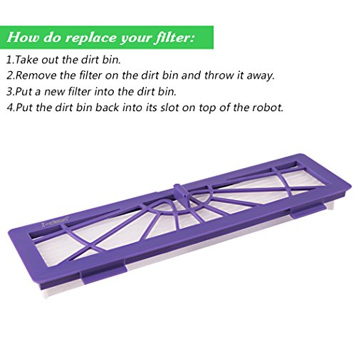 How to Replace Filter: Step 1: Take out the dirt bin. Step 2: Remove the filter on the dirt bin and throw it away. Step 3: Put a new filter into the dirt bin. Step 4: Put the dirt bin back into its slot on top of the robot.