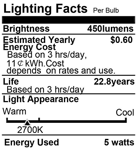 Aluminum + PC; 5W equivalent to a 40 watt incandescent bulb; Input Voltage: AC85-265V; Warm White 2700K; 450lumen, 180 beam angle.