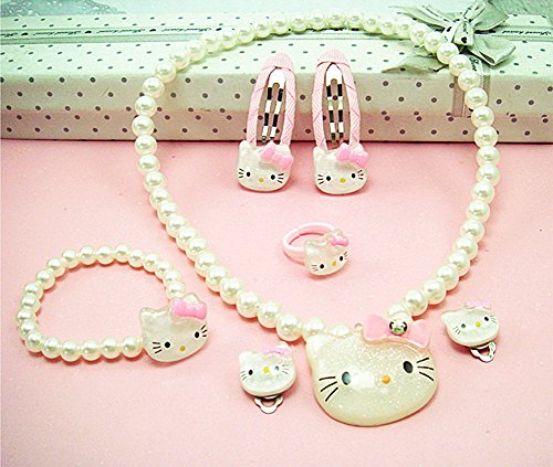 Adorable Hello Kitty inspired pearl 7-piece set. Include necklace, earrings, hair clips, bracelet and ring. A great gift for your little princess!