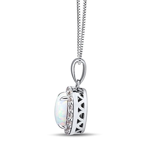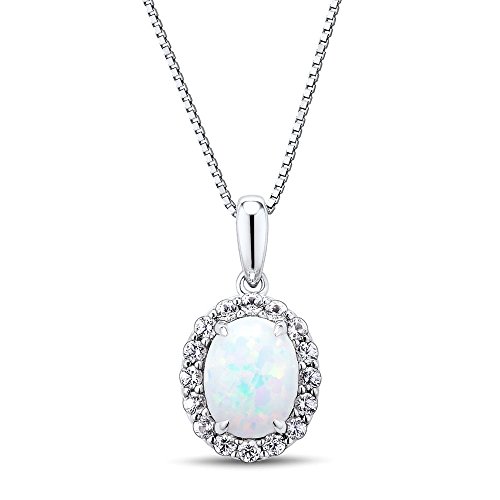 Stunning Necklace features a beautiful oval shape lab created opal surrounded by a halo of 16 Round Lab Created White Sapphires. The Created Opal is 9x7 MM and the Created White Sapphires are 1.75 MM each. The side view has lovely open work in the Rhodium Plated Sterling Silver. The pendant moves freely on an 18 Inch Box Style Rhodium Plated Sterling Silver Chain with Lobster Clasp. The pendant (without the bale) is approximately 5/8 inch long x 1/2 inch wide. There is a matching ring that you may purchase separately. We recommend cleaning with mild soapy water and gently polishing with a soft cloth. Do not use silver cleaners or household cleansers as they may damage the finish.Feature