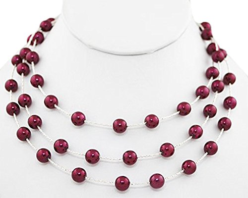 3 rows of cascading Bright Plum/Eggplant color pearl look on a beautiful silver plated chain. . The cascading rows fall gently an inch apart on your neck. Necklace can be work for a wedding or worn everyday to dress up a sweater or shirt. Length: 14"- 17" with attached extension. Small Silver Ball at end of extension to hang down the back when worn at 14"s Chain: Silver Plated Herringbone Chain Clasp: Lobster Size of Pearls: 8mm Plum Purple Pearl every 3/4" on silver chain For Bridesmaids or Formal Events: Purple pearls on silver work with an orchid colored, eggplant colored or deep plum colored gown.Feature