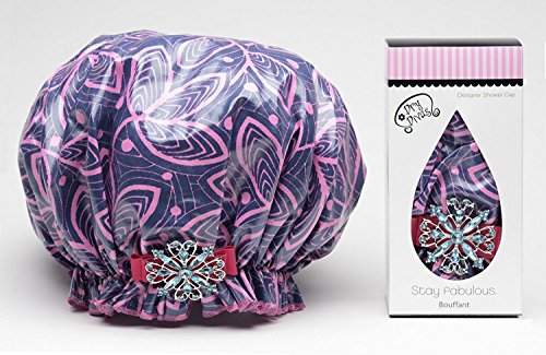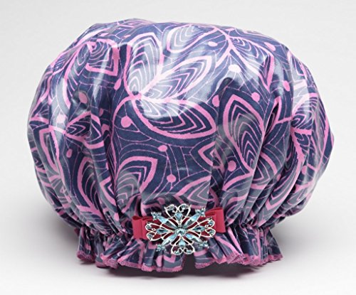 Dry Divas Designer Shower Cap For Women - Washable, Reusable - Large Bouffant Cap With Vintage Jeweled Brooch (Ivy League)
