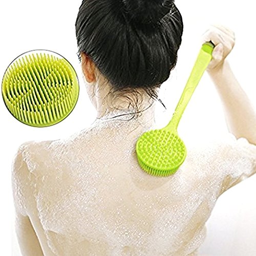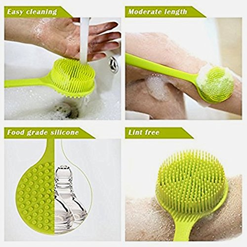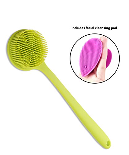 - PROMOTES BLOOD CIRCULATION AND CLEANSES – The body brush with flexible long handle can be used to apply lotion. It rinses clean and easy to dry, just hang it using the loop hole in the handle. The long soft silicone bristles are gentle and lather liquid shower gel very well. The reverse side with the shorter nubs is a great massager. The facial cleansing pad prevents dead skins, blackheads and white heads by gently yet deeply cleansing your pores.