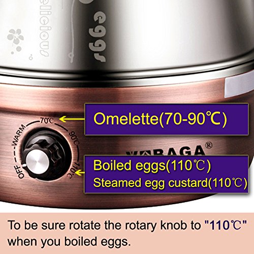 HASSLE FREE USE: This egg cooker steamer achieves the desired egg results in no time at all. Just fill with water in base tray, and load the rack, choose the temperature and wait for the lights off, which meant the eggs were done cooking,and then you need turn the dial to "off" and unplug the cord. Taste delicious soft, medium or hard-boiled eggs, scrambled, omelettes.