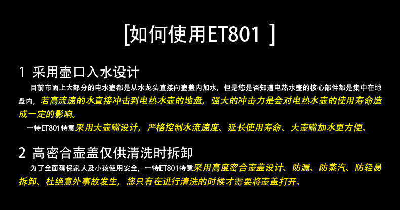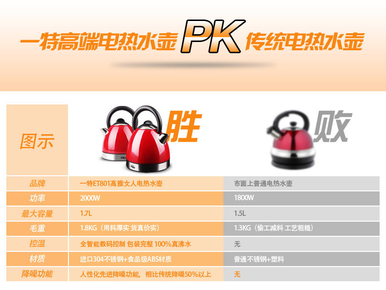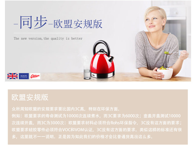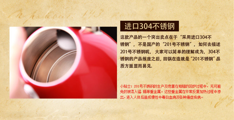 注意:目前淘宝上很多100元以下的低价水壶,因为成本原因,大多数采用的回料回收进行二次锻造,含有大量有害物质,长期使用,对于老人,小孩严重影响身体健康;