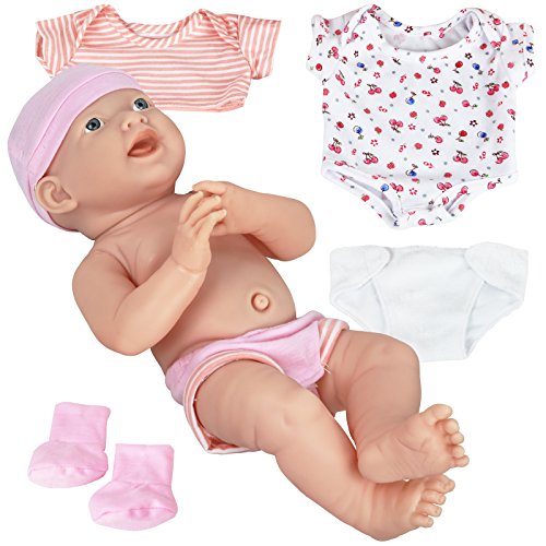 Set includes; newborn baby doll, set underwear, pair socks, hat ,T shirt and pamper.