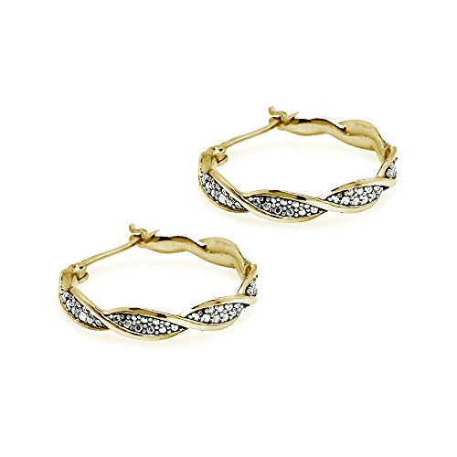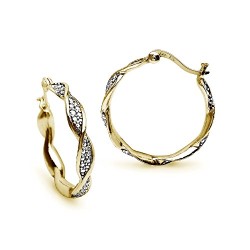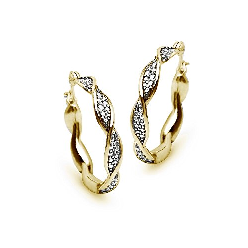 Round yellow gold flashed sterling silver hoops present a twist design with two small 1.3 diamonds in the pattern. They feature post and snap down closures.