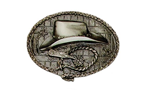 Product Description This oval-shaped pewter belt buckle features a cowboy hat and spurs at its center. Its background is detailed to look wooden and its edges are lined with rope design. This belt buckle is 100% Western at heart! 0