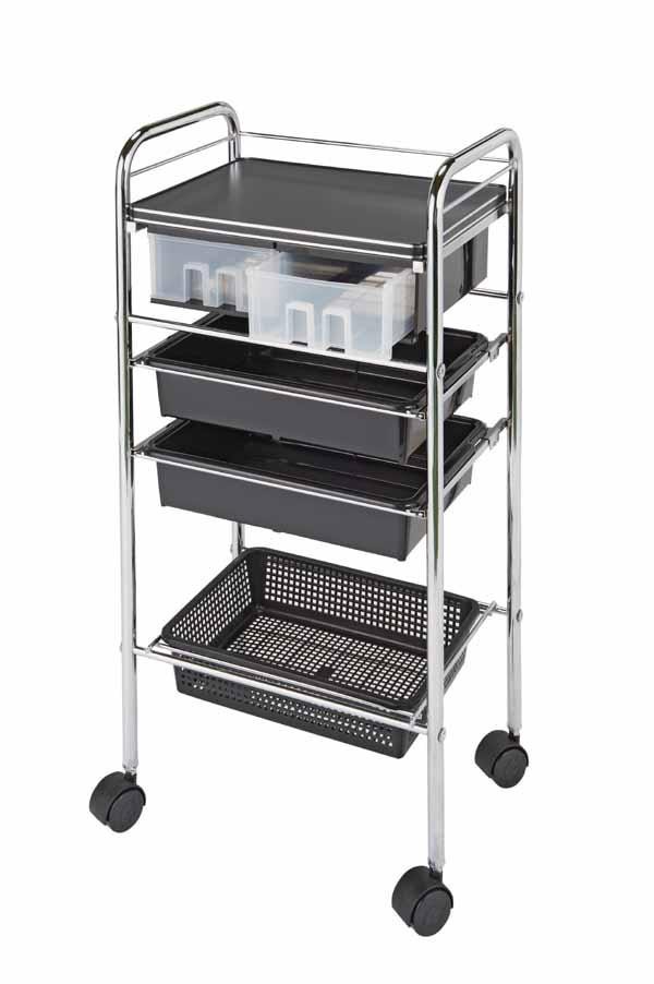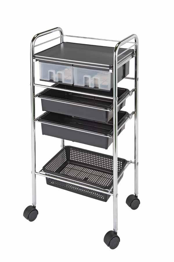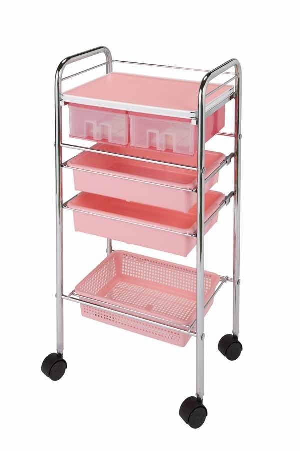 仕様天板1段、引き出し式深型パット2段、固定カゴ1段、引き出し収納ケース2個付き