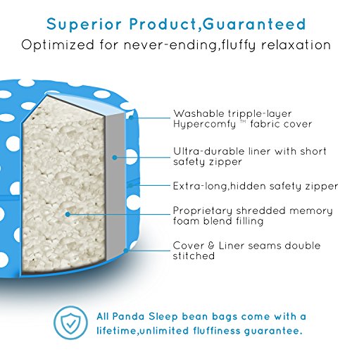 Studio : Panda Sleep Publisher : Panda Sleep Product Description TRADITION QUALITY: Panda Sleep bean bag covers are double-stitched with heavy duty yarn developed for military clothing, ensuring that you can enjoy your bean bag for years to come. Our triple-layer HypercomfyTM covers are tough, stain resistant and easily machine-washed in automatic cycle. HEALTH SAFETY: We exclusively use virgin foam that is certified by world-leading agencies and doesn't emit any harmful fumes. Our products are 100% free of cancer-causing flame retardants which our competitors here use. We guarantee that our bean bags are absolutely safe for you, your family and your friends. Why else would we use them ourselves all the time? PRICE: By cutting out the middleman and offering our product directly to the customer, we can offer the most competitive prices on the market. That's why we have no problem giving the Panda Sleep price guarantee: If you find a bean bag of comparable size and quality at a lower price anywhere, write to us and we will give you one for free! RELAXATION: Our proprietary memory foam blend offers unmatched and long-lasting fluffiness and soft comfort. The touch and feel of our premium fabric will make you instantly relax and never want to stand up again. We do not use cheap polystyrene beans which feel uncomfortable and go flat within weeks. SIZE CARE: Easily fits one teenager or young adult with up to about 80 lbs. body weight. 24" H x 30" W x 30" D. Recommended floor space is 42" x 42". Occasionally re-fluff for optimal comfort. Machine wash cover in automatic cycle and air dry. 0