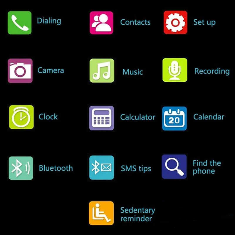 Function:Sleep Tracker,Calendar,Dial Call,Push Message,Alarm Clock,Calculators,Remote Control,Answer Call,Message Reminder,Interactive Music,Call Reminder