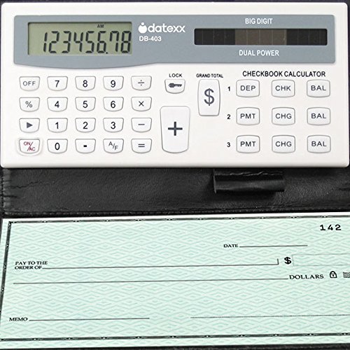 -. Binding : Electronics -. Brand : Datexx -. EAN : 0767469403802 -. Feature : Keeps track of a personal budget or income and expense records in one of the 3 independent memories / Solar powered so it will work anywhere, anytime. / Built-in long life lithium battery maintains your memory files / Lock mode lets you set a password in order to protect your data from unauthorized access / Money Manager calculator tracks and reviews up to 100 charges, withdrawals and deposits with the touch of a button. -. IsEligibleForTradeIn : 1 -. Label : Datexx -. Manufacturer : Datexx -. MPN : DB-40380 -. PartNumber : DB-40380 -. ProductGroup : CE -. ProductTypeName : CALCULATOR -. Publisher : Datexx -. Studio : Datexx -. Title : Datexx DB-403 3-Memory Checkbook Calculator + Credit Card Money Manager Combo Pack -. UPC : 767469403802