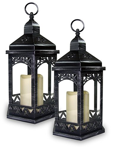 -. Feature : VINTAGE LANTERN. This is a great set of 2 distressed black candle lantern that measure approx 14" tall. Each one has a cream LED flame free candle inside. Each ivory candle has 5 hour timer. When set on timer mode, lantern automatically lights up at the same time each day. / MOROCCAN STYLE LANTERNS. Beautiful design with intricate detailing in a brushed black finish. Glass pannels are already attached to the lamp and the ring at the top comes in handy to hang these from a tree, patio, deck, tent or Shepard's hook. / FLAMELESS CANDLE WITH TIMER. Each black lantern has a LED unscented flameless candle included inside with 5 hour timer and on/off switch. Requires 3AAA batteries (NOT INCLUDED). Just turn the candle on at the time of the day you want it to start and it will go 5 hours from that time every night. No need to always be running around an turning on your lanterns at night. Have the peace of mind to walk out on your deck after dinner to the soft, warm glow of these beautiful lanterns. / INDOOR/OUTDOOR LANTERNS. The LED candle has a nice, soft, warm flickering glow. Since the candles are flameless they are smoke free and worry free. Safe to use around pets and children. Perfect for those night sitting out on the deck, by the beach or at the lake. Each lantern comes with a loop at the top so you can hang it anywhere. / LANTERNS measure approx. 13" tall but 14" with loop. 7" wide. 3 way switch: On/Off/Timer These are a cool hexagon shape. The candle can screw out of the base of the lantern if you would like to replace it or add any other decorations to the bottom of the lantern.