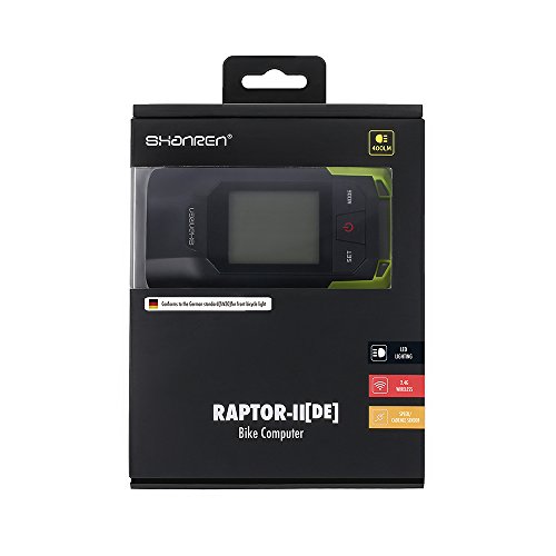 Studio : SHANREN TECHNOLOGY USA INC Publisher : SHANREN TECHNOLOGY USA INC Binding : Sports Product Description Shanren Raptor II in German bike light standard. It's not just recording, but lighting! Specifications: Model Number: Raptor II [DE] SR-BLC10-B Features: innovative two in one wireless bicycle computer with integrated LED headlight Anti-interference: the 2.4Ghz digital wireless system with strong anti-interference brings you the accurate cycling data Smart lighting system: automatic light downshift as a low battery warning Power saving mode auto wake-up: the main unit will be dormant while not getting data in 3 minutes and it will auto wake up while you are back to cycling again. Headlight brightness: 400LM Light source: Cree white LED1 Light work mode: High/Mid Light working time: 3hrs/6hrs Waterproof: IP65 Rechargeable Li-ion Battery: Polymer 2800mAh Lithium Battery Charging: Micro USB, 4hrs Weight: 120gram Package content: Package including: 1 x Main Unit (Raptor II[DE]) 1 x Bracket; 1 x Speed and cadence combo sensor; 1 x Spoke magnet 1 x Crank arm magnet 1 x USB Wire; 1 x Manual 1 x Hex key 8 x Zip ties Net weight: 120g Gross weight: 290g Gift box size: 165 x 130 x 45mm Guarantee: Limited warranty 1 Year main unit. Accessories and battery consumption excluded. 0