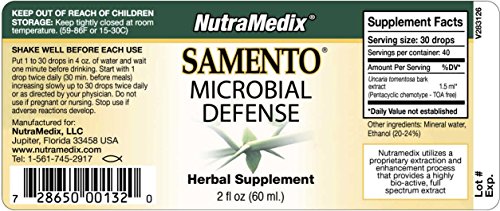 -. Binding : Health and Beauty -. Brand : Nutramedix -. Feature : MICROBIAL DEFENSE - Cat's Claw may offer microbial defense properties.* / POA RICH & TOA FREE - In 2000, NutraMedix introduced a rare type of Cat's Claw (Uncaria tomentosa) that does not contain the tetracyclic oxindole alkaloids (TOAs) that are found in traditional Cat's Claw. This coveted vine is a source of POA (pentacyclic oxindole alkaloids).* / PROP.R.IETARY WHOLE HERB EXTRACTION PROCESS - Highly bioavailable liquid for improved absorption. NutraMedix's unique enhancement process optimizes the whole herb for a more powerful broad-spectrum extract.* / FEEL THE DIFFERENCE - Put 1 to 30 drops in 4 oz. of water and wait one minute before drinking. Start with 1 drop twice daily (30 min. before meals) increasing slowly up to the 30 drops twice daily or as directed by your physician. Do not use if pregnant or nursing. Shake well before each use.* / OVER 20 YEARS OF NUTRACEUTICAL INNOVATION - Founded in 1993, NutraMedix supplies highly bioavailable nutritional supplements to health care professionals and consumers.* A majority of NutraMedix profits are donated to charitable organizations. -. Label : NutraMedix -. Manufacturer : NutraMedix -. ProductGroup : Health and Beauty -. ProductTypeName : HEALTH_PERSONAL_CARE -. Publisher : NutraMedix -. Studio : NutraMedix -. Title : NutraMedix - Samento Microbial Defense