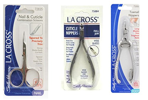 -. Feature : Sally Hansen LA Cross Nail & Cuticle Combination Scissors 72835 + Cuticle Nippers Wide Blade 75884 + Toenail Nippers 75886 / Great quality that is sure to last many years! Sally Hansen is a trusted brand that has been around for over 100 years. Unlike the generic implements, LA Cross by Sally Hansen is known for durability and quality. / Tweezers, Nippers, Scissors, etc. are all made from the highest quality metal. Sure to get through the toughest nails! Super fine and sharp scissors are guaranteed for easier grooming. / Precise items made from Stainless Steel with firm grips, and easy trimming!