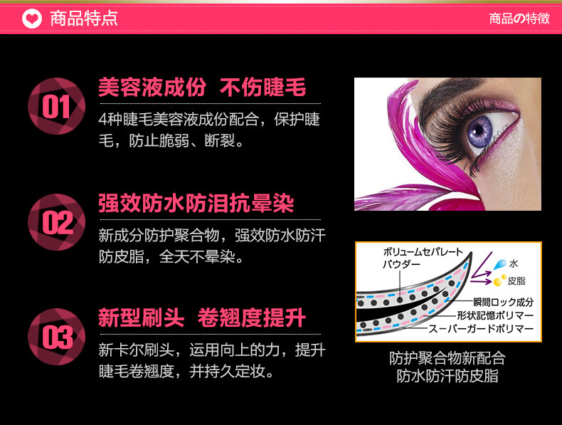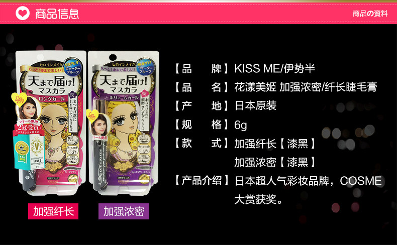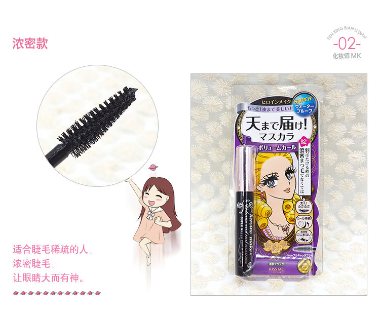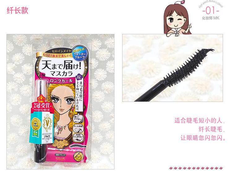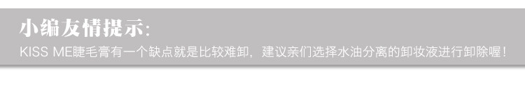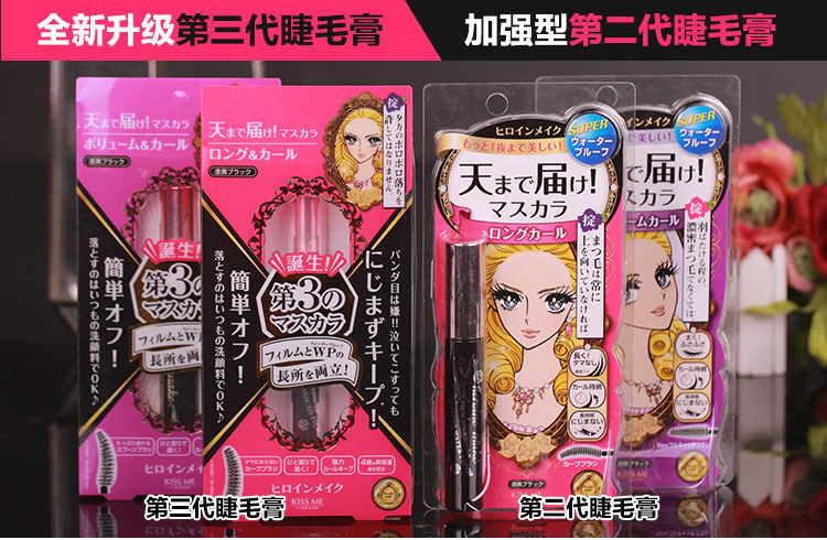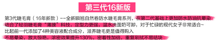 kiss me睫毛膏因大受好评,在今年推出16年新版——全新瞬翘自然卷防水睫毛膏,在 第二 代 基础上添加了4种美容液配合成分,非常滋养睫毛,再结合轻羽睫毛膏薄膜科技,更 加防水防油 抗晕染,浓密效果提升130%,重复擦拭也不容易变成苍蝇腿。新配方官方在卸妆方面也进行了 较大的改善,相对第二代的更好卸妆。