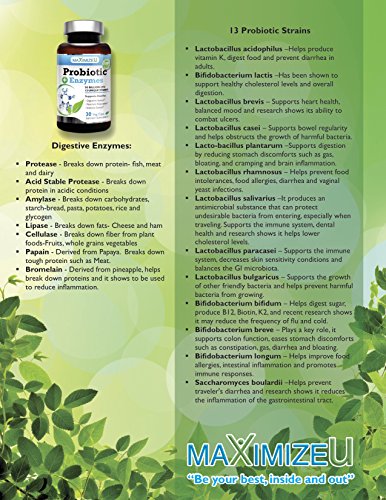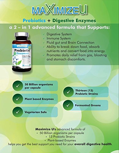 DIGEST BETTER, FEEL BETTER–Let’s face it, highly stressed lifestyles and convenient fast processed food does not help absorb all the nutrients needed by the body. Maximize U High Potency of 50 Billion CFUs with 13 Strains Plus Plant based Digestive Enzymes Supports better digestion, especially of difficult-to-digest foods. It replenishes the good bacteria needed to support a healthy immune system, and a fluid gut and brain connection.