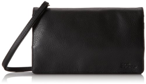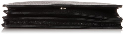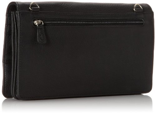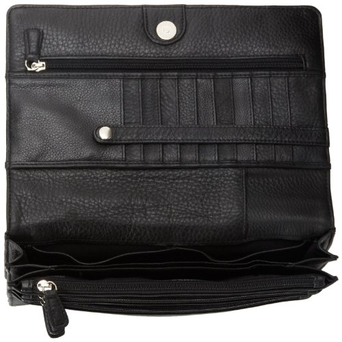 This multi-function organizer is secured with a magnetic snap. On the inner side of the flap there are ten credit card sleeves secured with a leather strap and also a zippered pocket. The interior of the organizer is gusted with a divider and contains two drop pockets on the back wall. Next there are three different sizes of zippered pockets, from largest to smallest. There is an additional zippered pocket found on the rear exterior. There is a removable and adjustable strap for a comfortable fit cross body or on the shoulder.Feature