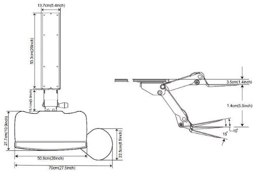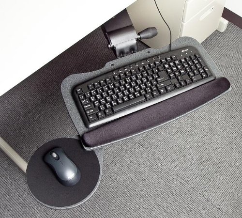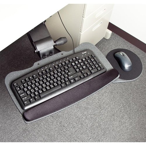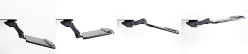 -. Feature : Maximum knee clearance assures the most comfort whether the keyboard tray is in use or stored away / Materials: steel (arm); medium-density fiberboard (keyboard & mouse tray); molded PU (palm rest) / No knob or lever needed for height adjustments; simply move to the desired spot and let go / Height adjustment ranges 5 1/4 inch / End of track to keyboard tray rear end distance: 5 1/2 inch