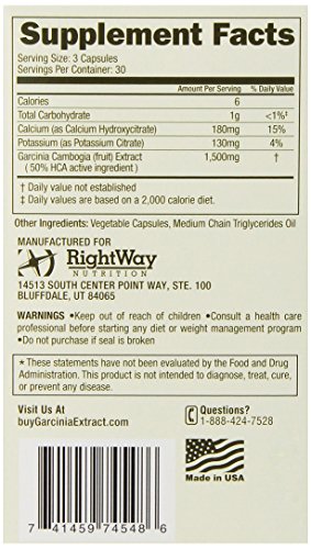 -. Binding : Health and Beauty -. Brand : RIGHTWAY NUTRITION -. Department : Health and Personal Care -. EAN : 0632181199657 -. Feature : Pure, with no additives and all natural / Comes from a pumpkin-shaped fruit that is grown in parts of southeast Asia and central Africa / 60% hydroxycitric acid (or HCA), the active ingredient in garcinia cambogia -. IsAdultProduct : 0 -. Label : RightWay Nutrition -. LegalDisclaimer : Keep out of reach of children. Consult a health care professional before staring any diet or weight management program. Do not purchase if seal is broken. -. Manufacturer : RightWay Nutrition -. MPN : 7180002 -. NumberOfItems : 1 -. PackageQuantity : 1 -. PartNumber : 7180002 -. ProductGroup : Health and Beauty -. ProductTypeName : HEALTH_PERSONAL_CARE -. PublicationDate : 2014-05-03 -. Publisher : RightWay Nutrition -. ReleaseDate : 2014-04-30 -. Studio : RightWay Nutrition -. Title : RightWay Nutrition Garcinia Cambogia Capsules, 90 Count (Packaging May Vary) -. UPC : 741459745486