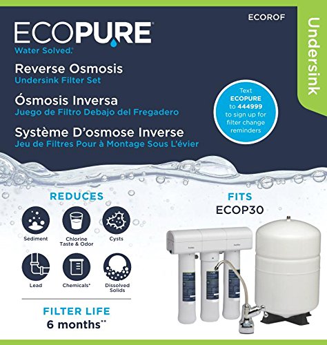 -. Feature : Designed for use in the ECOP309 EcoPure Reverse Osmosis Filtration System / Convenient encapsulated filter design allows for a quick, tool-free filter change without having to turn off your water supply. No hassle, no mess! / Certified to reduce numerous contaminants including chlorine taste and odor, sediment, cysts, lead, nitrates, chemicals, and dissolved solids / Six-month filter life: Filter should be replaced every six months for best filtration results / Text ECOPURE to 444999 to sign up for filter change reminders. Questions? Call the EcoPure helpline at (800) 693-1138.
