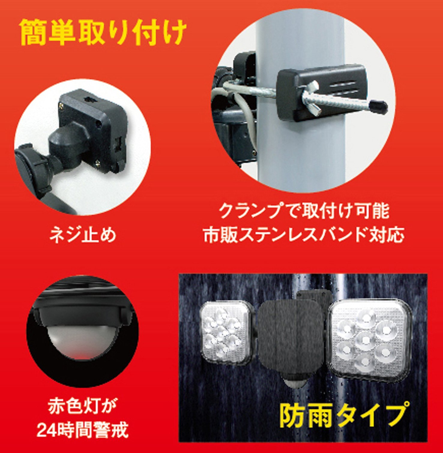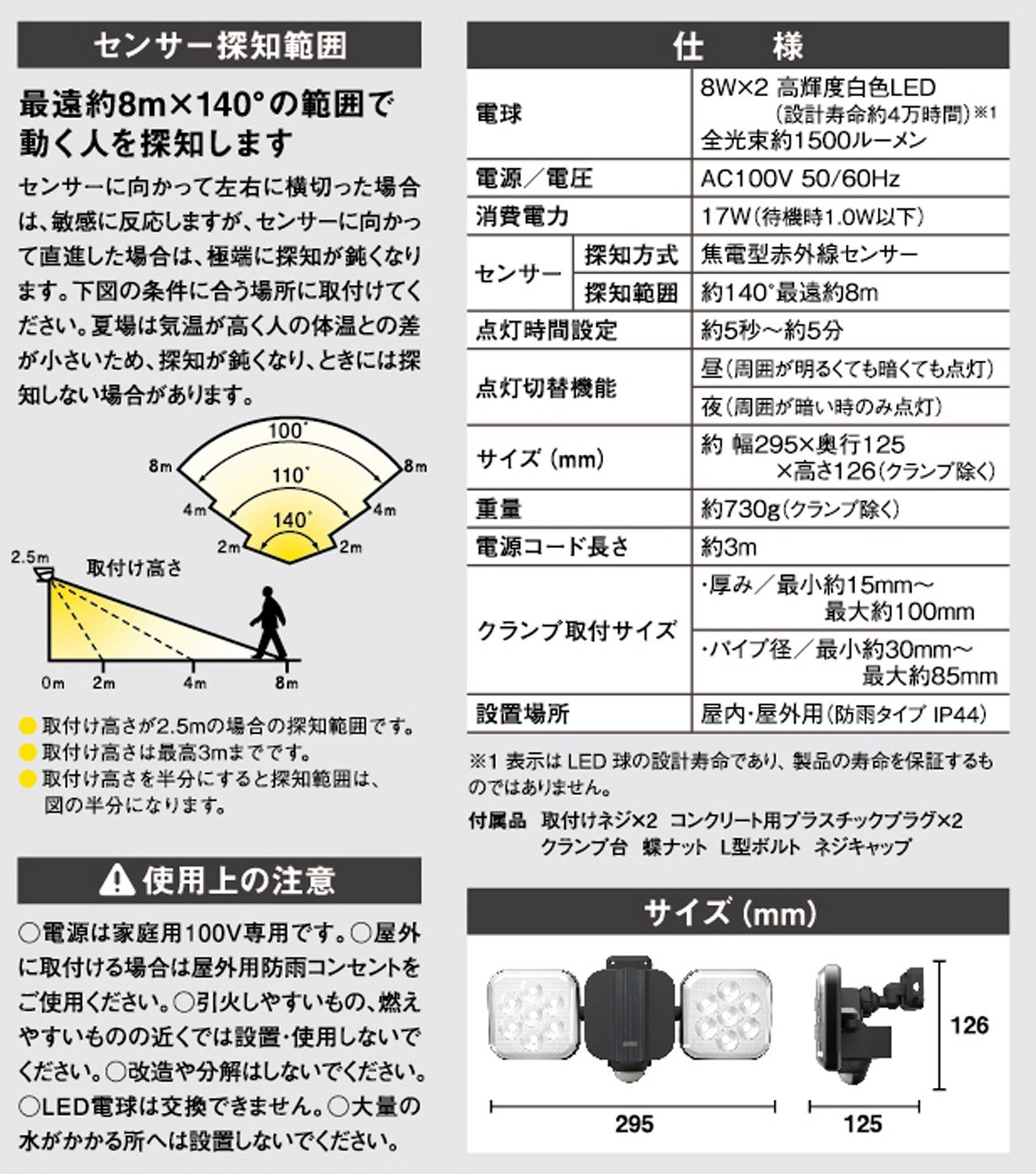 I think that it is supposed to fix to objects of various diameters, but in my case I tried to set it in a square gutter fixed on the wall of the building, Because there is not so much clearance on the back of the gutter, the L bolt was too long to use as it was, bent the blanket 90 degrees and set it in parallel with the wall and fixed it. I think that it is better to design based on the assumption that the original setting is fixed to the left and right rather than fixing in the front and rear. The sensitivity of the sensor needs to be set slightly downward to set it to a height of 2 - 2.5 m, and for the brightness it is a little worried because it is 8 W, but it is very bright and quite satisfactory.