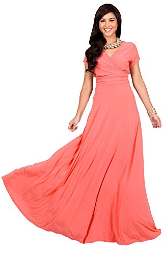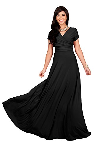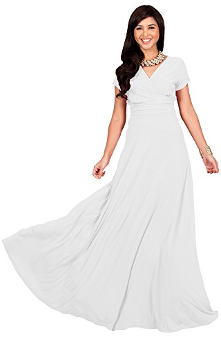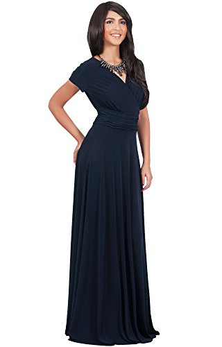 This is an absolutely elegant maxi dress with sleeves from Koh Koh. This design features short cap sleeves and the chest crossover neckline. The dress comes with an elastic mid-waist and a generous empire waist, giving the dress a lovely flowing skirt. This design is very popular with weddings as a bridesmaid dress, mother of the bride or mother of the groom dress and also some customers have used the white or ivory color as an understated wedding dress. These versatile maxi dresses are available in color Navy Blue and Plus Size Extra Large / XL / 14-16.
