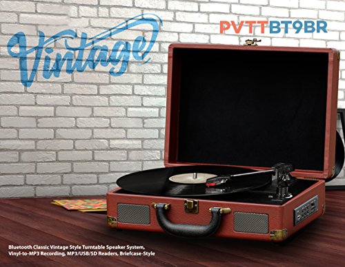 Record Player Turntable Old Fashioned Bluetooth Vinyl-to-MP3 Recording, MP3/USB/SD Readers, Briefcase-Style With Built In Speaker By Pyle -Brown (PVTTBT9BR)
