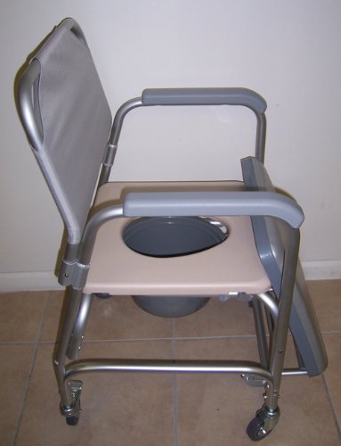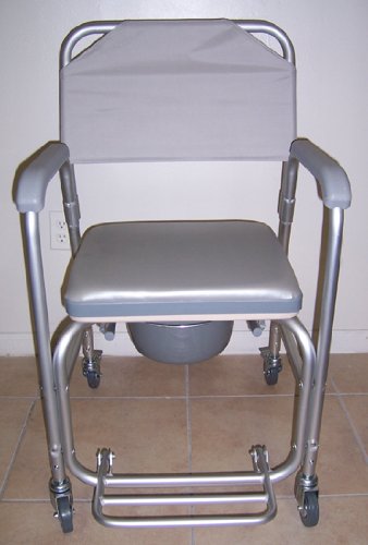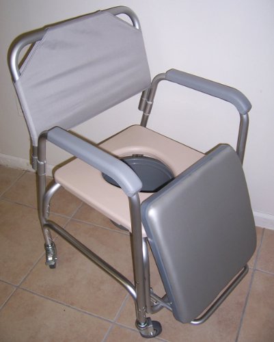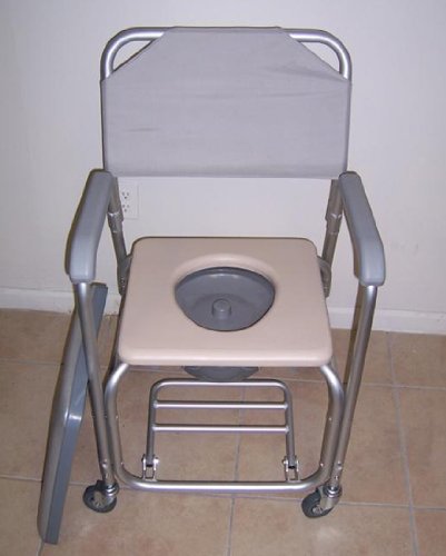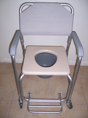 - Title : Commode - Shower chair with wheels, padded seat, commode pail and cover. Tool free with removable back rest. Dual plastic caster locking wheels. Overall width 21", padded seat 20 1/2" wide, height fixed 38", depth 16", 18 1/4" between arms. Weight capacity 300lbs.