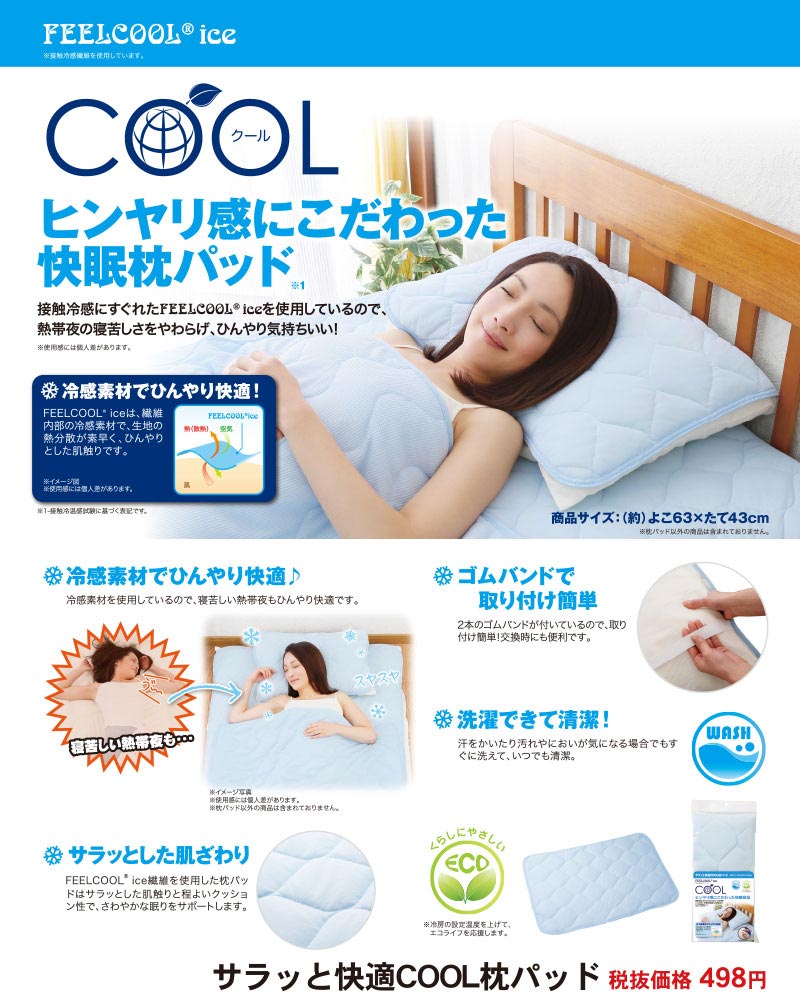 | 材質 | 本体表側:ポリエステル65%・ナイロン35% 本体裏側・パイピング:ポリエステル80%・綿20% 本体中わた・ゴム:ポリエステル100% | ご使用上のご注意 | ●お肌に合わない場合や、かぶれ・かゆみ等を感じた場合はすぐにご使用をおやめください。 ●火気のそばや高温多湿な場所、直射日光の当たる場所には保管しないでください。 ●ご使用中、またはご使用後に異常を感じた場合はすぐにご使用をおやめください。 ●生地部分に爪を立て、無理に引っ張ると破れるおそれがありますのでご注意ください。 ●本品は接触冷温感性にすぐれた繊維を使用しておりますが、本品自体が冷たくなることはありません。 ●快適さの感じ方には個人差があります。 ●本来の目的以外でのご使用はおやめください。 ●印刷の都合上、実際の商品と多少色が異なる場合があります。 |