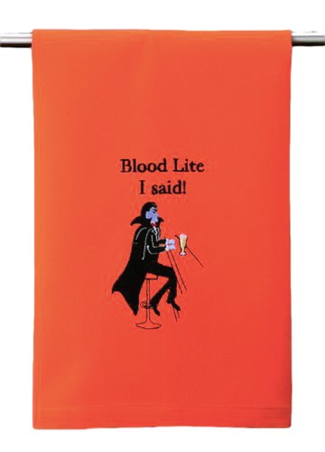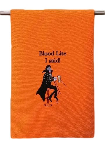 "BLOOD LITE, I SAID!" Halloween Vampire Man with Beer Kitchen Bar Dish or Hand Guest Towel, 16 Inch X 25 Inch, Orange & Black